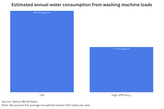 Laundry isn’t just a time sink — it’s a serious resource drain. According to the National Park Service, the average household uses 41 gallons of water per load. Older machines can use up to 45 gallons per cycle, while high-efficiency models cut that down to 14–25 gallons, says Nature World News. That’s a big difference when you're doing 400 loads a year.